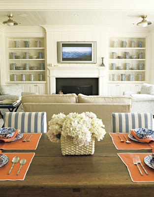 That restricted sort of palette is conscious. The initial impression is that it's plain, but it's a house that slowly reveals itself to you — so it stays interesting when you live there. There are a lot of subtle variations in textures and colors — mostly blues, whites, beiges — and lots of different patterns in the fabrics, the rugs, the spongeware. That's what saves it from blandness and makes it come to life. Often when people decorate with the blue-and-white look it fails, because it's just blue and white. It's like dressing all in black. It works if there's black patent with black silk with black wool...the subtle variations that I mentioned
